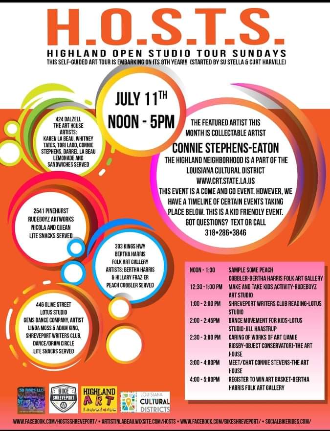 Shreveport Writers Club will participate in H.O.S.T.S. (Highland Open Studio Tours Sundays) on July 11, 2021 at Lotus Studio, 446 Olive St, Shreveport, LA.